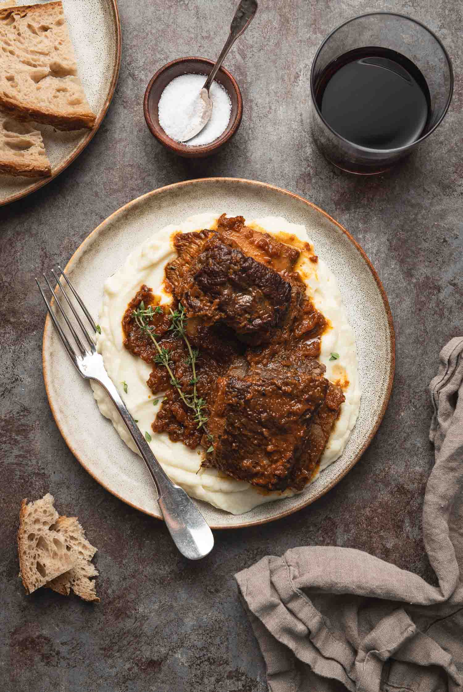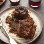 Here, I’ve served the short ribs with mashed cauliflower (my recipe here) but any number of sides would work just as well. Even a simple salad and a loaf of crusty bread to mop up the rich, flavorful sauce wouldn’t elicit any complaints from your guests. I’ve also recently served this dish with my gratin Dauphinois and roasted asparagus. These polenta fries would make a nice side, too.